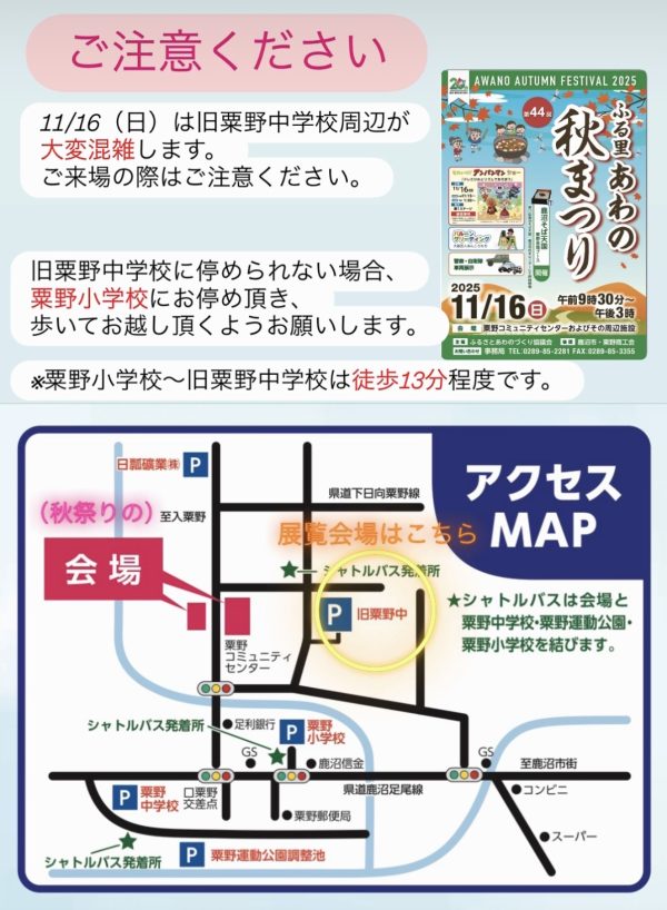 11/16(日)は「ふる里あわの秋まつり」の開催に伴い、旧粟野中学校周辺の道路が大変混雑する恐れがあります。
